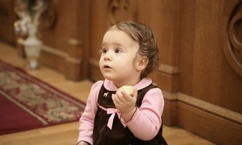 Символ священного ужаса – священник стоит у престола и будто из самой глубины отчаяния: «Боже, очисти мя грешнаго!» Символ мирной радости – ребенок, жующий просфорку. Дети страшно любят просфоры. Вы тоже заметили?