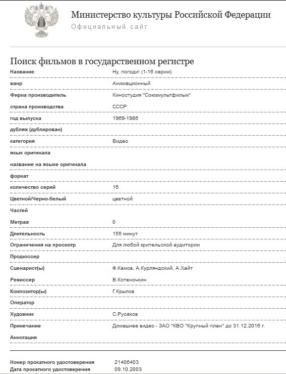 Сериалу «Ну, погоди», как и многим другим советским мультфильмам и кинофильмам уже давно присвоена возрастная категория «Фильм разрешён для показа в любой зрительской аудитории», которая в соответствии со статьей 5 Федерального закона № 126 от 22 августа 1996 года «О государственной поддержке кинематографии» указана в его прокатном удостоверении[i]. Руководство телеканалов само не вправе определять возрастную категорию информационных продуктов, имеющих прокатное удостоверение. Они должны использовать проставленную в нем возрастную категорию для определения времени показа таких кинофильмов и мультфильмов в эфире телеканала.