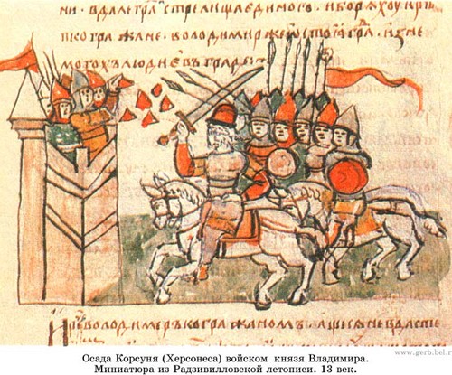 Но так или иначе вероломные действия греков приводят Владимира в ярость, он забывает о том, что он почти христианин и захватывает ближайший греческий город — Херсонес (по-славянски — Корсунь), откуда посылает ультиматум грекам. Владимир требует отдать за него царскую сестру, иначе он подвергнет Константинополь разорению. Цари отвечали, что могут выдать сестру только за христианина. Владимир сообщает о своей готовности креститься.