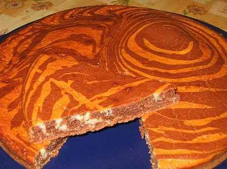 Замесить тесто из перечисленных ингридиентов, кроме какао. Тесто разделить на 2 части. В одну часть добавить какао. На середину формы выкладывать по одной ложке сначала белого, потом коричневого теста, пока тесто не закончится. Выпекать в духовке, разогретой до 200 градусов, 30 минут.