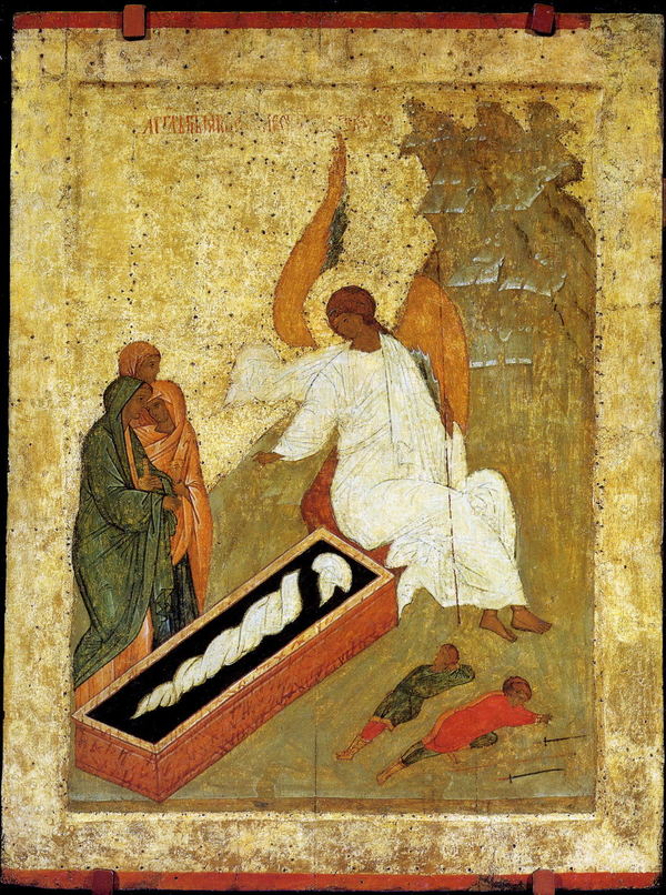 Жены иерусалимские, обнимающие друг друга, нерасторгаемые и в горе своем великом, как триплетеная веревка — «Вервь треплетена не расторгнется» (Еккл.4:12), взирают на тайну гроба, повинуясь жесту Ангела-тайноводца, научающему их тому, что написано у Пророков, прежде чем Сам Иисус Воскресший явится им – и в тот день они не спросят Его ни о чем (Ин.16:23).
