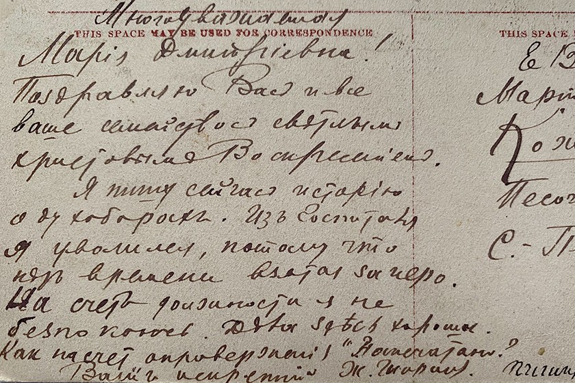 «Многоуважаемая Мария Дмитриевна! Поздравляю Вас и все Ваше семейство со светлым Христовым Воскресением!
