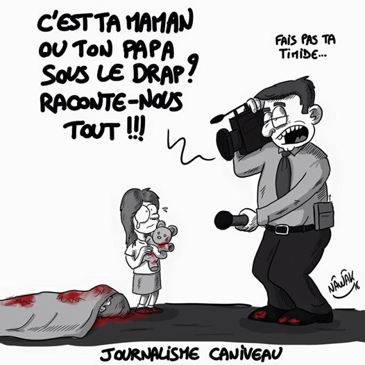Перестать смотреть ссылки с информационным кровавым мясом. Понятно, что сотни и тысячи будут их все равно смотреть, но в своем доме эту дверь в ад надо закрыть. Информационное кровавое мясо – это интервью с пострадавшими и родственниками, на месте трагедии, это «А ты знаешь, что твои товарищи погибли?», это всегда, всегда врасплох. Один из французских телеканалов поймал мужчину в Ницце, у него только что убили жену, и стал его расспрашивать о произошедшем… Французы нарисовали по следам телерепортажей: «Детка, а кто под покрывалом – папа или мама? Ну-ка расскажи нам все об этом!».