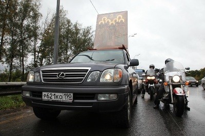 Колонна байкеров с иконой Богородских святых в сопровождении автомобилей ДПС проследовала по Горьковскому шоссе до расположенного в Ногинске храма блаженной Матроны Московской, где состоялся молебен.