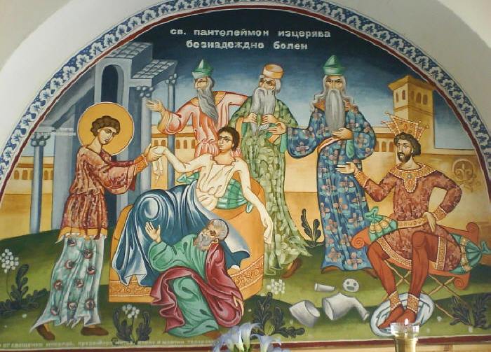 Целитель Пантелеимон родился в городе Никомидии в семье знатного язычника Евсторгия и был назван Пантолеоном. Его мать Еввула, христианка, хотела воспитать сына в вере, но умерла, когда будущий великомученик был еще юн. Отец отдал Пантолеона в начальную языческую школу, окончив которую, юноша начал учиться врачебному искусству у знаменитого в Никомидии врача Евфросина и стал известен императору Максимиану (284-305), который захотел видеть его при своем дворе.