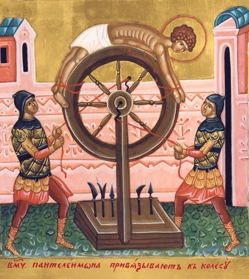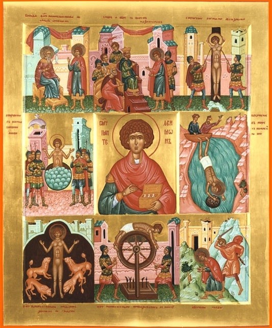 Из зависти врачи донесли императору, что святой Пантелеимон лечит христианских узников. Максимиан уговаривал святого опровергнуть донос и принести жертву идолам, но святой Пантелеимон исповедал себя христианином и на глазах императора исцелил расслабленного Именем Иисуса Христа. Ожесточенный Максимиан казнил исцеленного, восславившего Христа, а святого Пантелеимона предал жесточайшим мукам: его повесили на дереве, рвали железными когтями, обжигали свечами, потом растягивали на колесе, бросали в кипящее олово, бросили в море с камнем на шее.