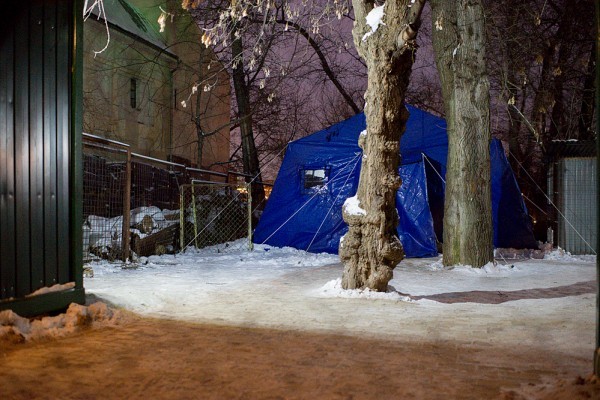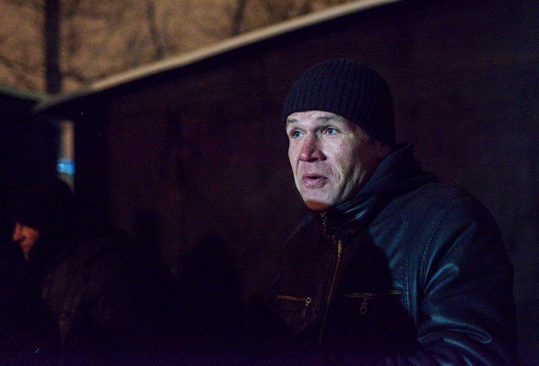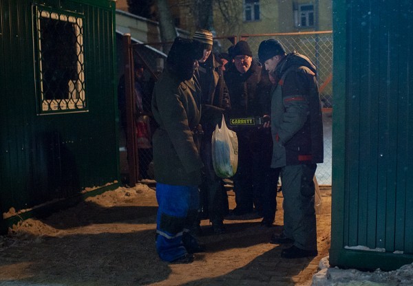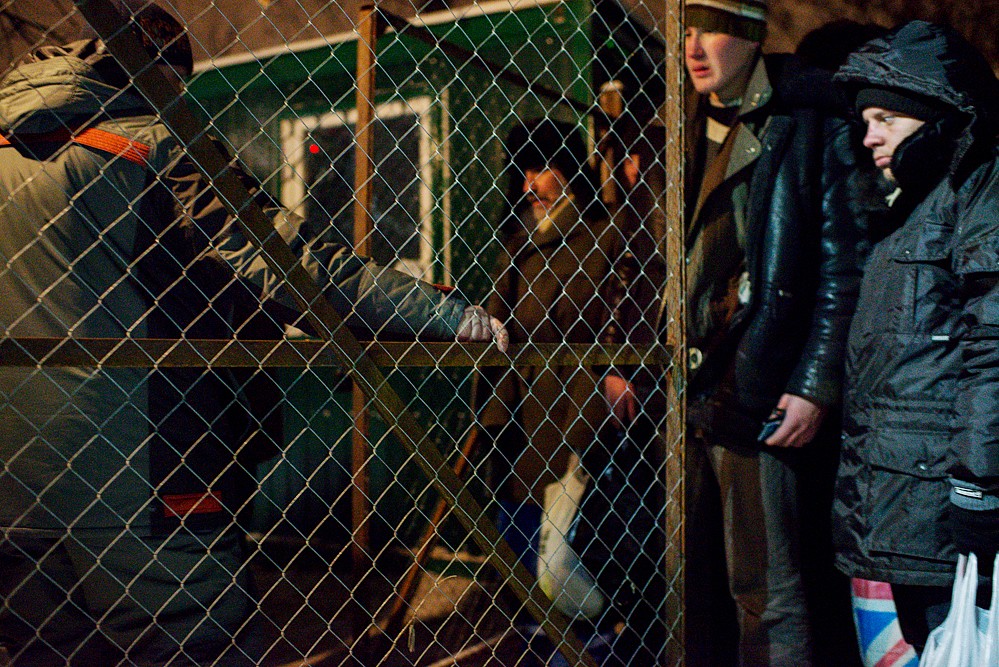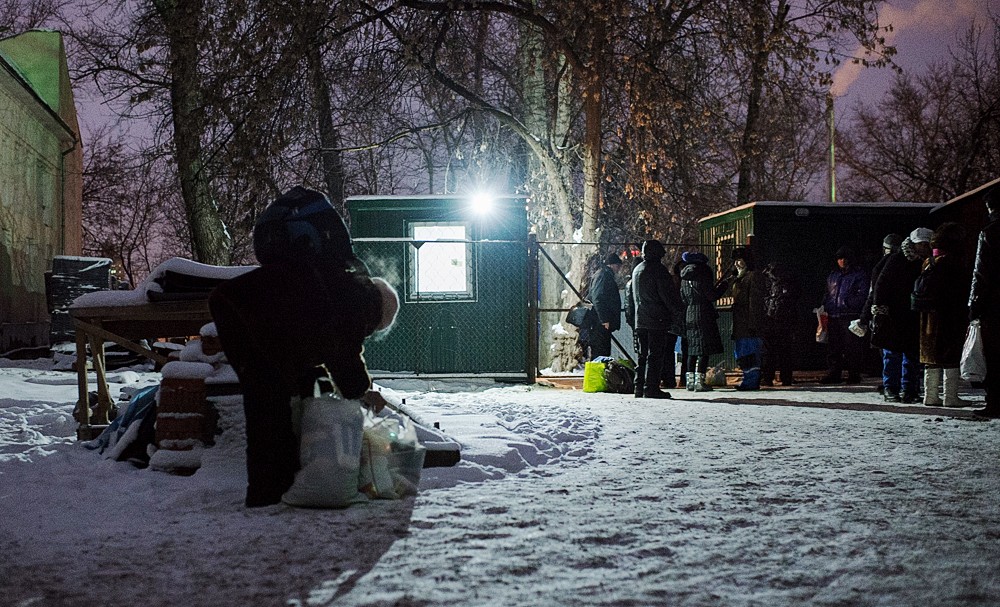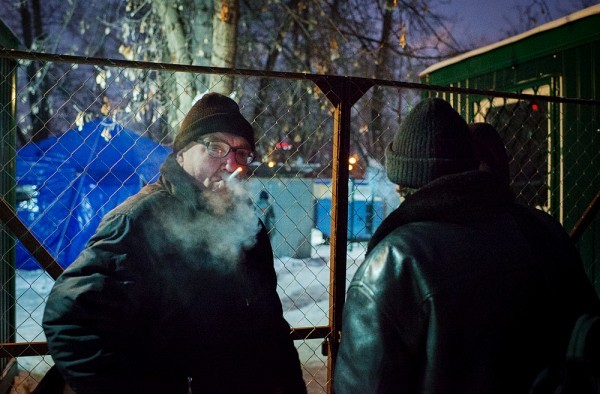 На часах 18:30, но перед входом в недавно открывшийся ангар, где бездомные спасаются от холода, уже стоит толпа людей. Их еще не так много — человек 30, постепенно количество их возрастает. Разбившись на «стайки» по интересам, одни стоят возле закрытых железных ворот, молчаливо озираются вокруг и смолят дешевые папиросы, время от времени выпуская клубы едкого дыма. Другие приглушено что-то обсуждают, эмоционально жестикулируют, по-простецки дергают друг друга за рукав или воротник. А третьи, присев на корточки, угрюмо наблюдают за происходящим, иногда выдавая окружающим что-то на грубом тюремном арго.