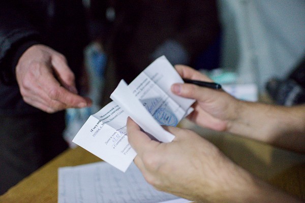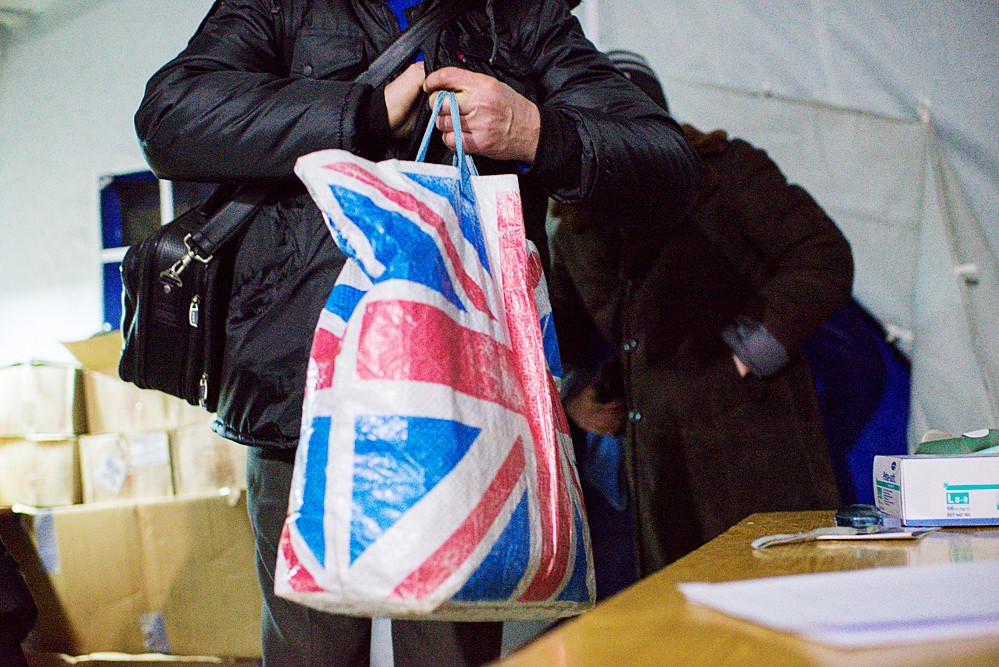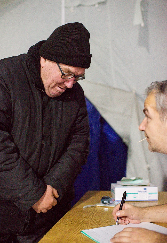 В палатке у входа стоит стол. За ним работник социальной службы записывает имя-фамилию и дату рождения каждого пришедшего