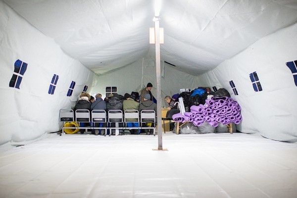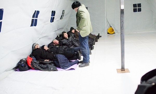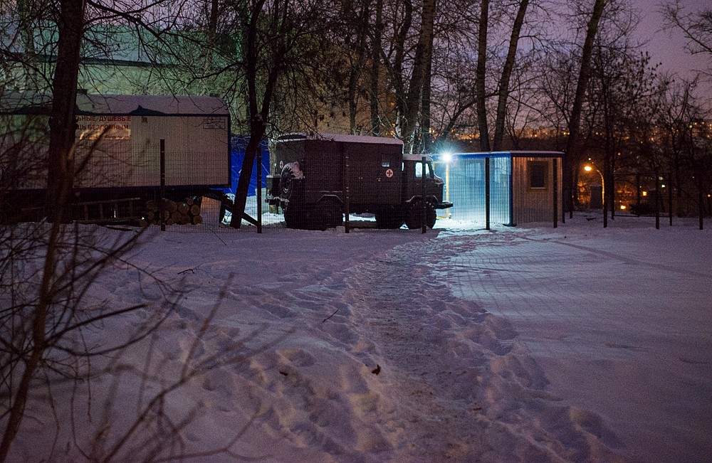 Уже на второй день был побит рекорд вместимости: единовременно ночлег здесь обрели около 70 бездомных. Естественно, прежде чем занять свое место в ангаре, каждый из них прошел проверку на металлодетекторе, зарегистрировался у дежурного соцработника, прошел санитарную обработку в стоящем неподалеку вагончике с мобильными душевыми кабинами, а также сдал свою одежду на дезинфекцию в специально оборудованный армейский автомобиль. После всех этих процедур бездомные получают возможность с 19.00 до 10.00 пребывать в просторном ангаре, в который тепловыми пушками непрерывно нагнетается горячий воздух.
