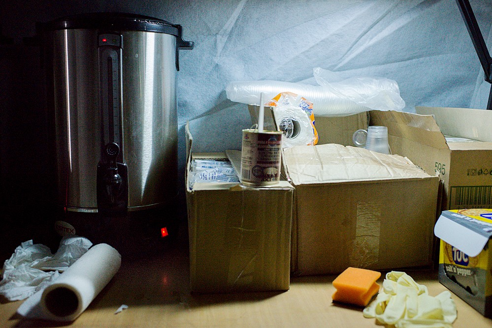 В углу палатки — горячие титаны с кипятком, пластиковые стаканчики, печенье. Но еду пока не дают: сегодня не пришло еще ни одного волонтера, и некому заниматься едой