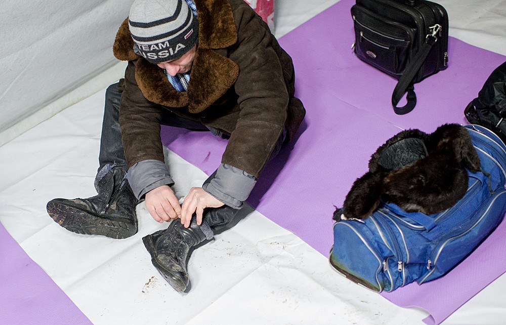 Наконец пришедшим разрешают пройти в палатку и расположиться на ночлег на специальных туристических ковриках